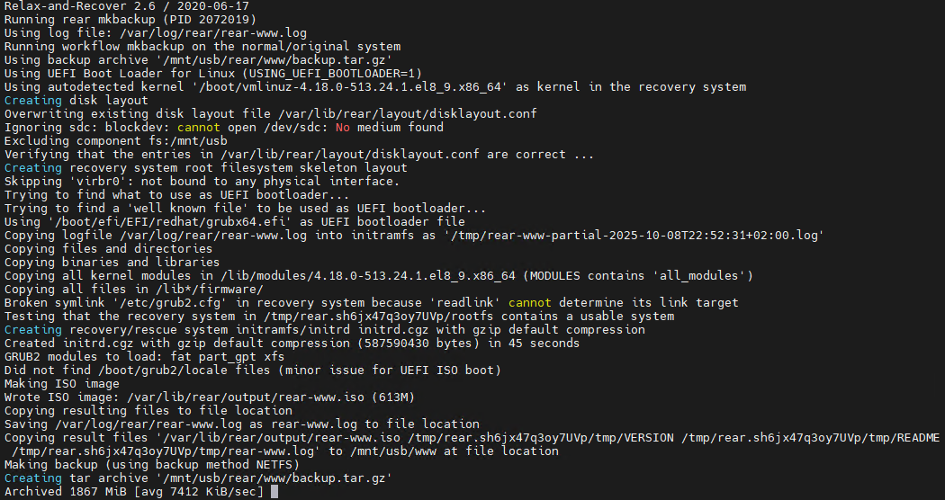 Ukoliko su nam potrebni ovi fajlovi, dovoljno je da u konfiguracionom fajlu ReaR obrišemo deo vezan za proceduru BACKUP_PROG_EXCLUDE kako bi alat uradio kompletan backup mašine. Takođe, ovde smo postavili putanju OUTPUT_URL=file:///mnt/usb koja će uraditi backup na naš eksterni hard disk. O tome kako se povezuje eksterni hard disk ili USB na RHEL možete pročitati na posebnom blog postu. Ako imate dovoljno prostora, možete uraditi backup i na samoj Linux mašini – ali taj proces nije preporučen jer u slučaju oštećenja mašine ili hardvera možete ostati bez rezervnih kopija podataka.